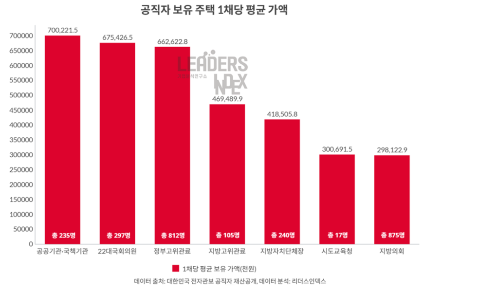 직군별 1인당 평균 보유 주택 수는 정부 고위관료가 1.89채로 가장 많았다. 지자체장이 1.87채로 뒤를 이었고 지방의회와 공공기관·국책연구기관 공직자는 각각 1.71채를 보유했다. 국회의원의 평균 보유 주택 수는 1.41채였다.