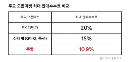 쿠팡은 주요 오픈마켓의 최대 판매수수료 비교 자료를 공개했다. 이 자료에 따르면 쿠팡의 수수료는 업계 최저 수준으로 최대 10.9%에 불과했다.