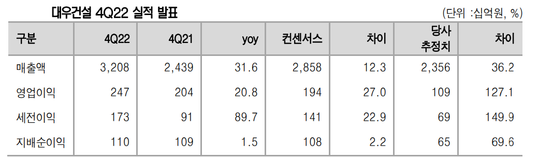 대우건설의 4분기 매출액과 영업이익은 각각 전년동기대비 31.6%, 20.8% 증가한 3조2080억원, 2470억원을 기록했다.