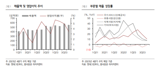 흥국증권에 따르면, 현대그린푸드의 4분기 매출액은 5464억원으로 전년 대비 7.1% 증가하고 영업이익은 190억원으로 23% 늘며 전분기에 이어 호실적으로 기록할 것으초 추정된다. 엔데믹으로 전환되면서 단체급식, 식재, 외식사업의 매출 호조가 지속되고 있다는 평가다.