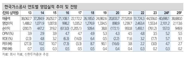신한투자증권에 따르면, 2024년 영업이익은 별도 1.7조원, 연결 2.1조원 달성이 예상된다. 올해 운전자금 감소에 따른 요금기저 및 적정투자보수 하락이 예상되나 2023년 일회성 비용 반영에 따른 기저효과로 두 자리 수 증익이 가능할 것이란 전망이다.