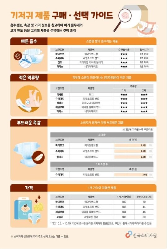 소비자원이 소비자 100명을 대상으로 기저귀 안감을 평가한 결과 마른 상태에서는 마미포코(에어핏밴드형), 슈퍼대디(리얼소프트 밴드), 하기스(네이처메이드) 제품이, 1회 소변을 흡수한 상태에서는 슈퍼대디 제품이 시험 대상 10개 제품 중 가장 부드러운 것으로 나타났다.