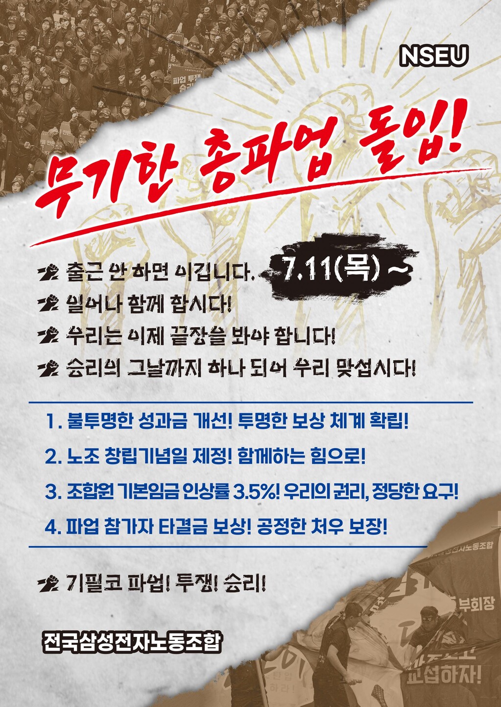 전삼노는 10일 "1차 총파업 이후 사측의 대화 의지가 없어 11일부터 2차 무기한 총파업에 나선다"고 밝혔다. 2차 총파업은 11일부터 진행된다. 삼성전자 창사 55년 만의 첫 무기한 총파업이다.