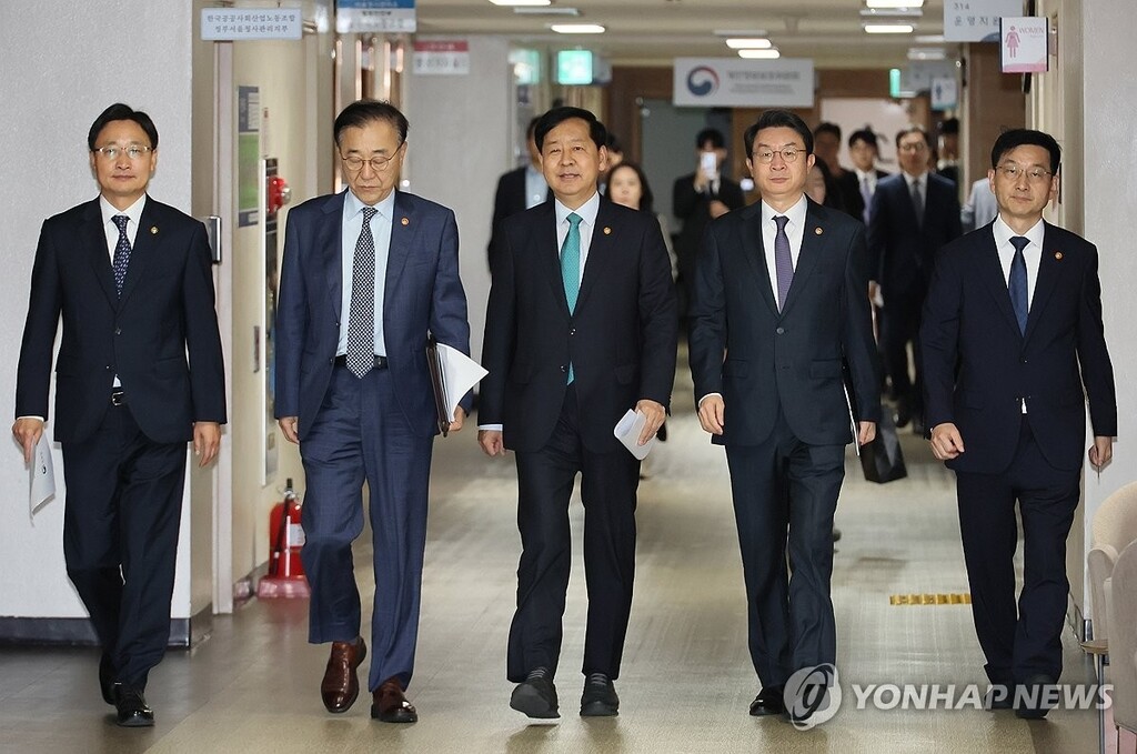 | 구윤철 부총리 겸 기획재정부 장관이 15일 서울 종로구 정부서울청사에서 주택시장 안정화 대책 관계부처 합동브리핑을 위해 이동하고 있다. 왼쪽부터 임광현 국세정창, 김윤덕 국토교통부 장관, 구윤철 경제부총리, 이억원 금융위원장, 윤창렬 국무조정실장. (사진=연합뉴스) |