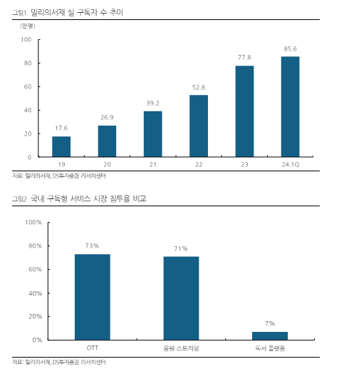 현재 국내 독서 플랫폼 구독형 서비스 시장 침투율은 10% 미만이며 밀리의서재 시장점유율이 60%를 상회하고 있어 동사의 성장이 곧 시장의 성장으로 이어질 수 있다는 판단이다.