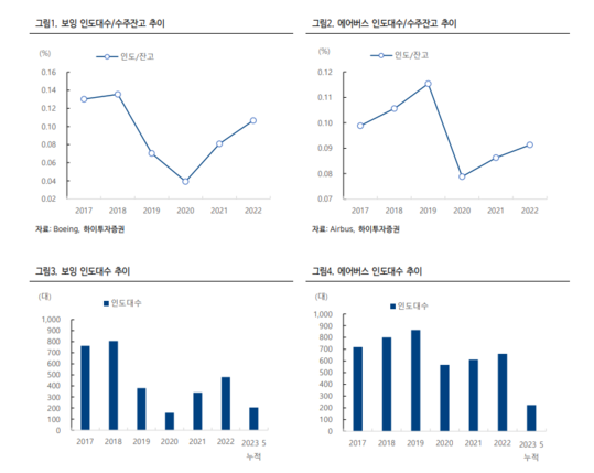 배세호 하이투자증권 연구원은 "코로나 19 팬데믹 기간 침체되었던 항공 여객 시장은 빠르게 회복하고 있다"며 "IATA(International Air Transport Association)은 2023 년 항공 트래픽이 2019 년의 92%에 이를 것으로 예상하고 있고 이에 그동안 기재를 축소했던 항공사들을 중심으로 빠르게 주문이 늘고 있다"고 판단했다.