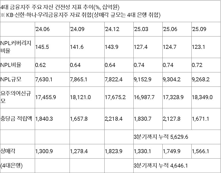 또한, 4대 은행은 같은 기간 4조 6,461억 원어치의 부실 채권을 상·매각했으며, 이는 2018년 이후 3분기 누적 기준 최대 기록이다.