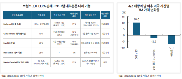 우지연 DS투자증권 연구원은 "트럼프 정부의 보편적 상호관세 정책은 위헌으로 판결될 공산이 크다"고 판단했다.