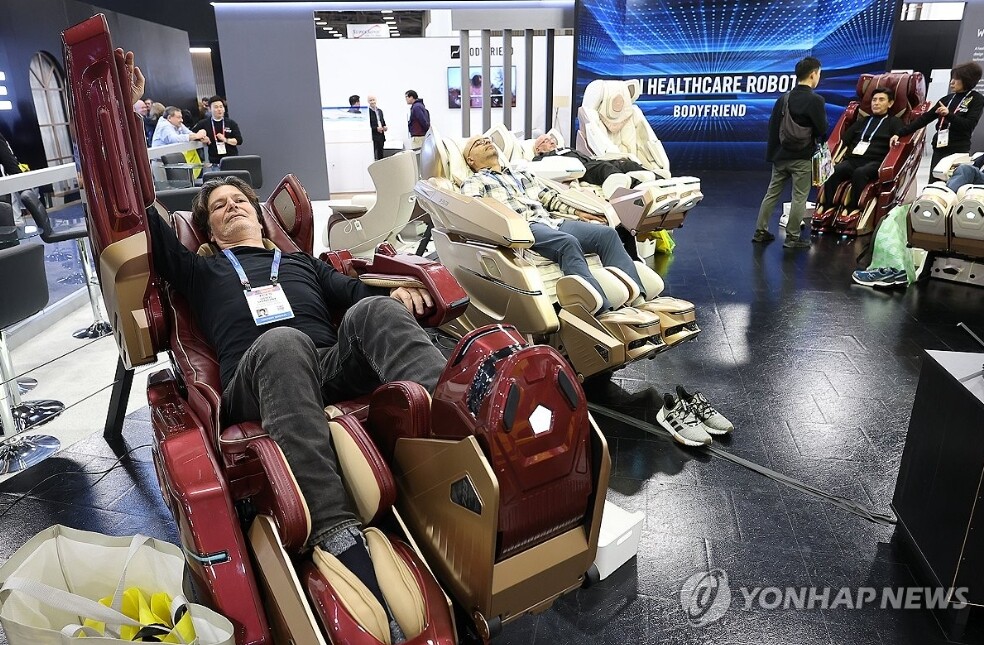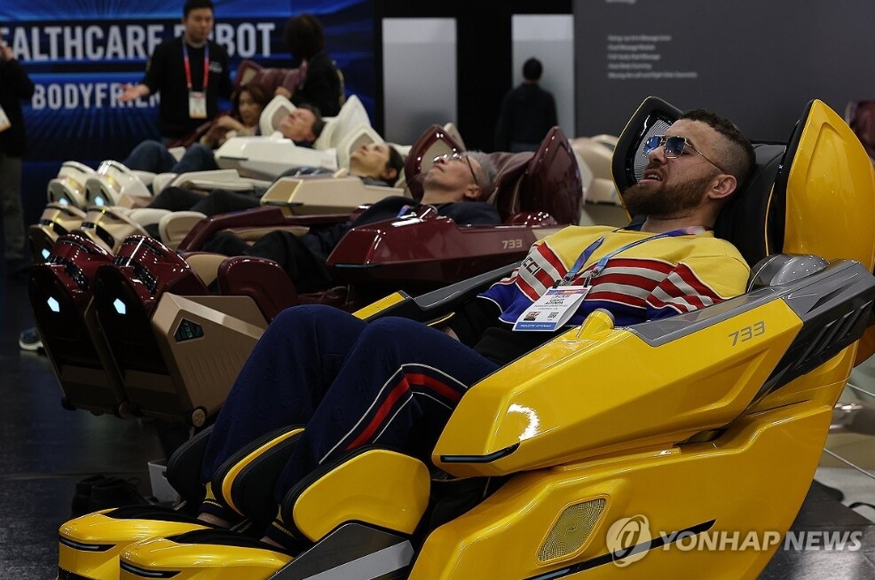 | 6일(현지시간) 미국 네바다주 라스베이거스 컨벤션센터(LVCC) 바디프렌드 부스에서 관람객들이 안마의자를 체험하고 있다. (사진=연합뉴스) |