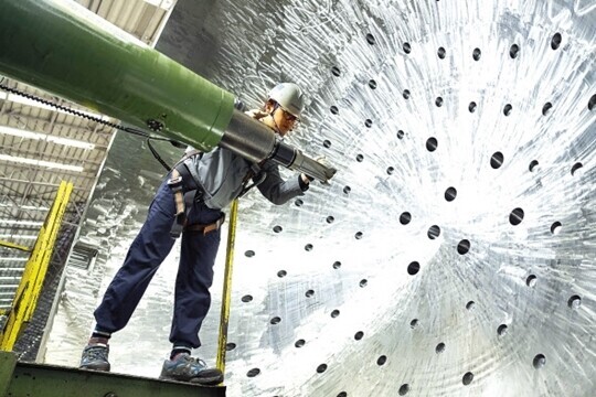 | 두산에너빌리티 창원 본사 원자력 공장에서 직원이 교체형 원자로헤드를 살펴보고 있다. (사진=두산에너빌리티) |