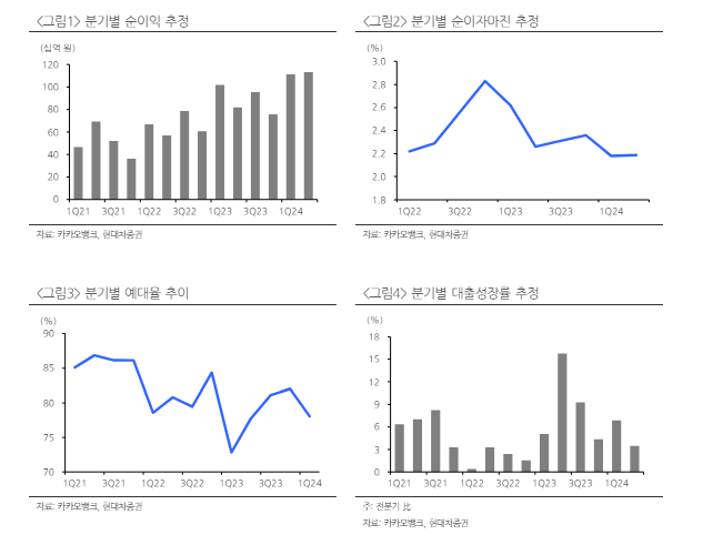 이홍재 현대차증권 연구원은 "대손비용률은 비경상 요인 없이 전분기와 유사한 61bp, 판관비도 특이사항은 제한적일 것"이라며 "플랫폼 수익 등은 아직 두드러지는 수준은 아니나 전분기와 유사하게 안정적인 성장세를 지속할 것"이라고 판단했다.