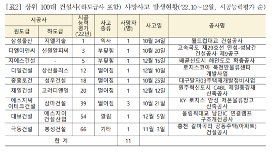삼성물산, DL이앤씨, GS건설, DL건설, 중흥토건, 제일건설, 대보건설, 극동건설 공사 현장에서도 사망자가 발생한 것으로 나타났다.