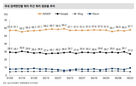 미래에셋증권에 따르면, 5월에도 NAVER의 검색 엔진 점유율은 57% 수준으로 보이며 월간 총 쿼리 수는 연초 이후 오히려 증가한 상황이다.