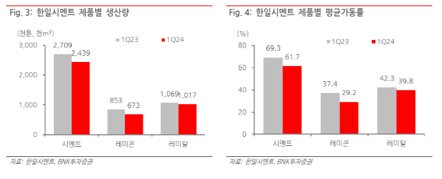 매출액과 평균 판매단가를 감안하면 1분기 시멘트 판매량은 전년동기대비 11.2% 감소한 것으로 추정된다. 같은 방식으로 계산하면 레미콘과 몰탈 판매량도 전년동기대비 각각 21.4%, 3.5% 감소했다. 신규 건설공사 현장에 직접 투입되는 레미콘 물량이 가장 많이 줄어들었다는 분석이다.