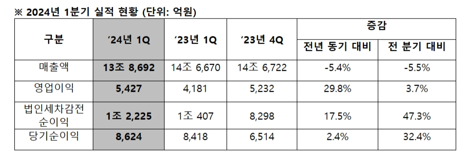 지난해 같은 기간과 비교해 매출은 5.4% 감소했지만, 영업이익과 당기순이익은 각각 29.8%, 2.4% 늘어났다.