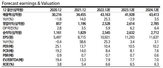 백광제 연구원은 “2023년 부문별 영업이익 기준 영업가치와 상장 지분가치(60% 할인)에 순현금을 가산한 기업가치를 주당 계산한다”면서 “지속적인 주가 부진으로 목표주가 상향 시 주가 괴리 확대되나, 이미 과도 한 지분가치 할인이 적용돼 있다”고 분석했다.