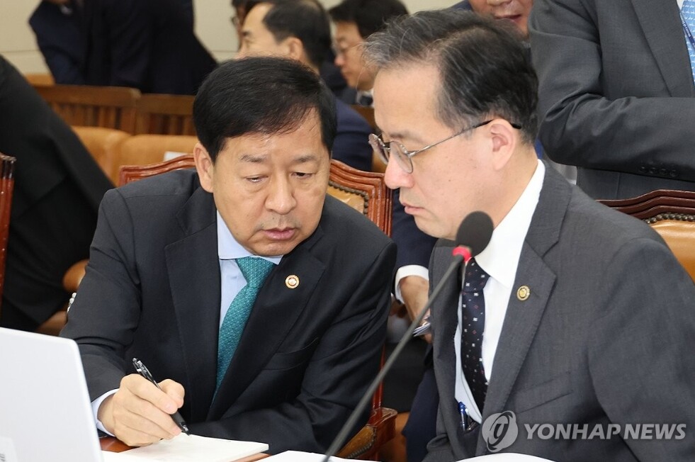 | 구윤철 부총리 겸 기획재정부 장관이 17일 서울 여의도 국회에서 열린 기획재정위원회 전체회의에서 내년 예산안 관련 질의가 이어지자 이형일 기획재정부 1차관과 대화하고 있다. (사진=연합뉴스) |