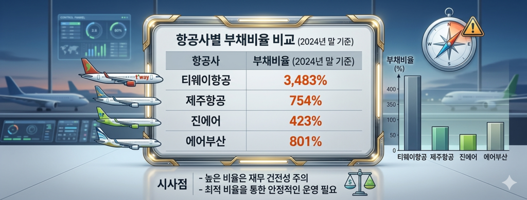 특히 티웨이항공은 유럽 노선 취항을 본격화한 2024년 이후 실적이 급격히 악화되어, 지난해 말 기준 부채비율은 국내 LCC 중 가장 높은 3483%를 기록했다.
