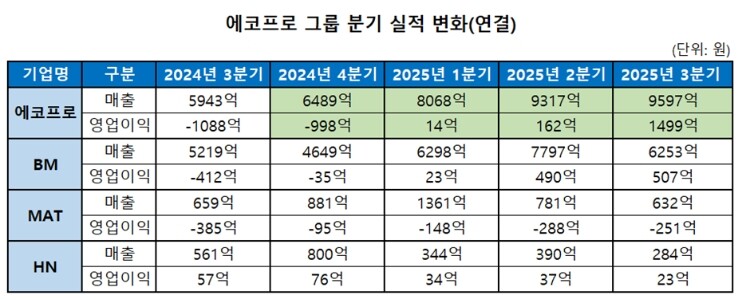 주요 자회사인 에코프로비엠은 3분기 매출 6253억 원, 영업이익 507억 원을 기록했다.