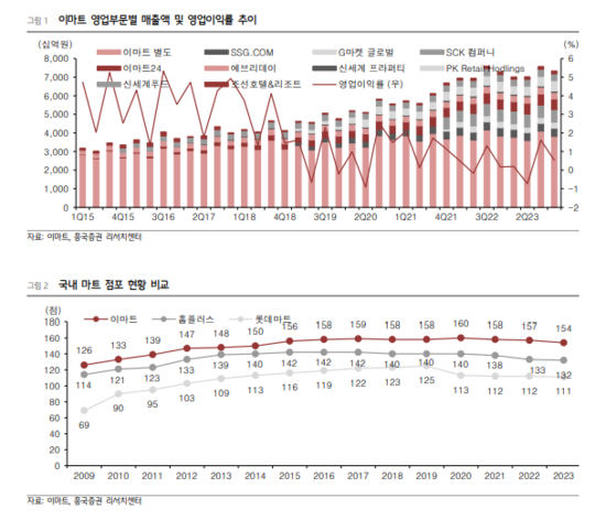 이마트의 2분기 연결기준 매출액은 7.3조원으로 전년 대비 1.7% 증가했고, 영업손실은 530억원으로 전분기에 이어 부진한 실적이 이어졌다. 별도(할인점, 트레이더스, 전문점)의 부진과 함께 연결 자회사들도 영업이익도 감소했기 때문이란 평가다. 전문점의 선전에도 불구하고 할인점과 트레이더스는 기존점 성장률 부진과 함께 고정비 부담 확대 등으로 전년동기비 영업이익이 부진한 실적을 기록했다.