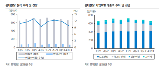 삼성증권에 따르면, 롯데렌탈의 3분기 매출액은 6899억원으로 전년 대비 3.9% 감소하고, 영업이익은 813억원으로 전년 대비 13.5% 감소를 기록할 것으로 추정된다. 매출액과 영업이익이 전년 대비 감소하는 이유는 올해 초부터 중고차 렌터카 사업을 확대하면서, 중고차 매각 이익이 감소했기 때문이라는 분석이다.