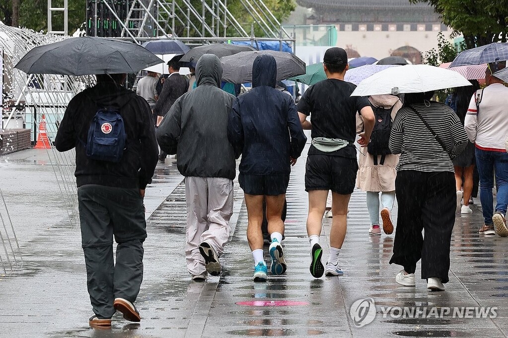 | 비가 내린 13일 서울 종로구 광화문광장에서 시민들이 달리고 있다. (사진=연합뉴스) |