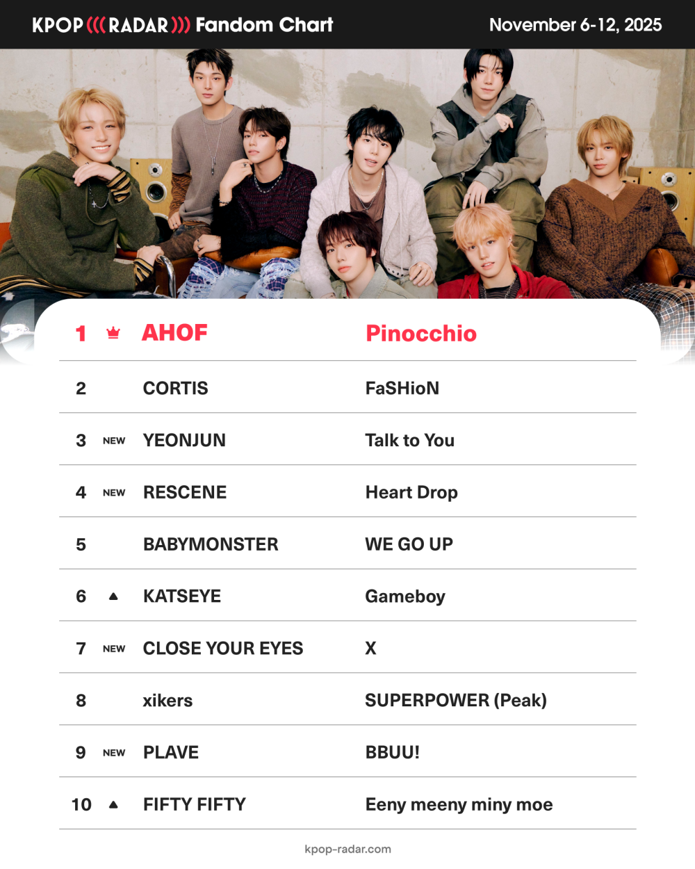 이번 주 주간 팬덤 차트 상위권에는 아홉에 이어 코르티스의 ‘패션(FaSHioN)’이 2위, 연준의 ‘톡 투 유(Talk to You)’가 3위로 새롭게 진입했다. 이 외에도 리센느의 ‘하트 드롭(Heart Drop)’, 클로즈 유어 아이즈의 ‘엑스(X)’, 플레이브의 ‘뿌우(BBUU!)’ 등이 TOP 10에 이름을 올렸다.