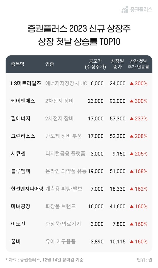 2023년 국내 증시 신규 상장주 중 공모가 대비 상장 첫날(종가 기준) 가장 많이 오른 종목은 ‘LS머트리얼즈’, ‘케이엔에스’다.