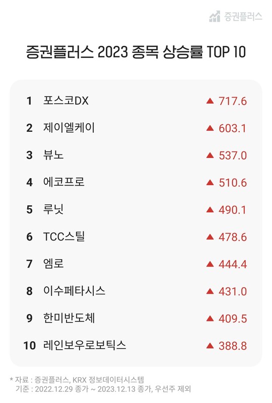 두나무는 국민 증권 애플리케이션 증권플러스에서 2023년 증시 결산 결과 ‘포스코DX’가 상승률 1위 종목에 올랐다고 20일 발표했다.