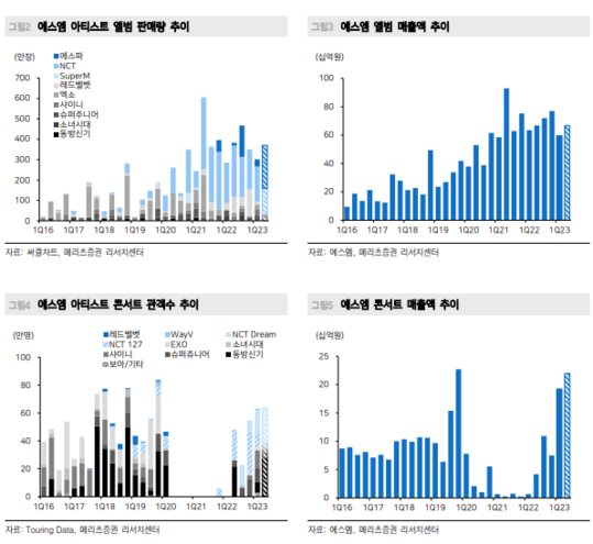 정지수 메리츠증권 연구원은 "EXO, NCT Dream, aespa 등 주요 아티스트 컴백으로 하반기 실적 개선이 기대된다"며 2023년 에스엠의 연결 매출액은 전년 대비 14.4% 늘어난 9736억원, 영업이익은 50.7% 증가한 1371억원으로 전망했다.