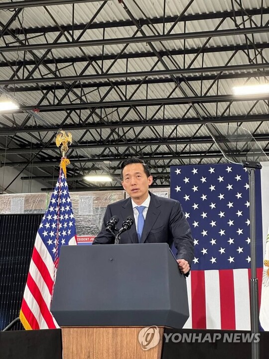 | 김동관 한화그룹 부회장, 美 조지아주 달튼에서 태양광 프로젝트 설명 중 (사진=연합뉴스) |