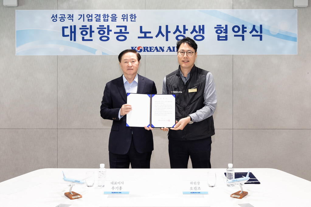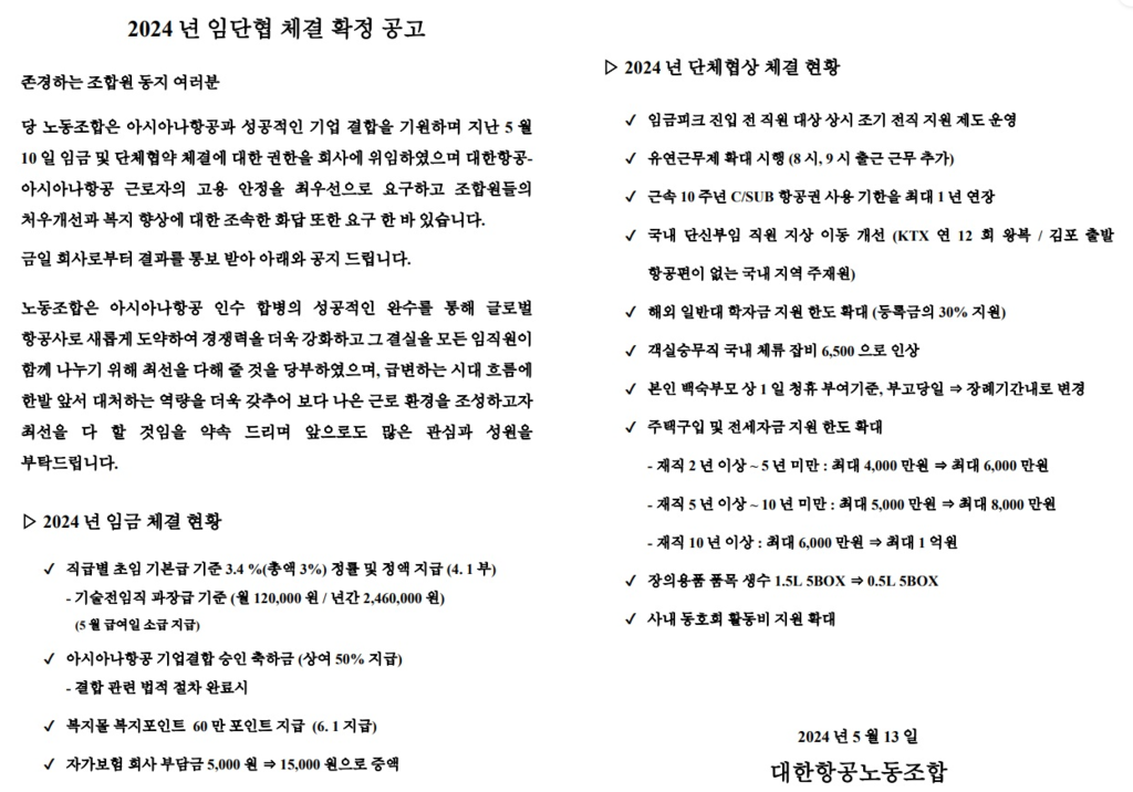 앞서 지난 10일 노사상생협약식에서 대한항공노동조합은 아시아나항공과의 성공적인 기업결합 마무리를 위해 올해 임금교섭 권한을 모두 회사에 위임했다고 밝힌 바 있다.