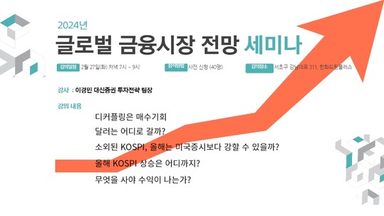 이 세미나는 2024년 증시 전망에 관심 있는 투자자, 향후 투자 방향을 모색하는 이들, 재테크에 첫발을 내딛는 초보자는 물론, 금융 전공 대학생과 투자 교육에 관심 있는 일반인에게도 유익한 시간이 될 것으로 기대된다.