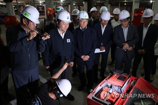 | 원희룡 국토교통부 장관(왼쪽에서 두번째)이 8월 6일 경기도 양주시 덕계동 양주회천 A15 아파트 주차장에서 보강공사 상황을 살펴 보며 철근 탐지 장비에 대해 설명을 듣고 있다. (사진=연합뉴스) |