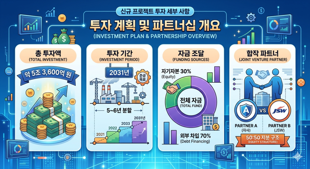 나머지 70%(약 3.7조 원)는 프로젝트 파이낸싱(PF) 등 외부 차입을 통해 조달하며, JSW와의 50대 50 합작 방식을 통해 독자 투자 대비 리스크를 대폭 낮췄다.