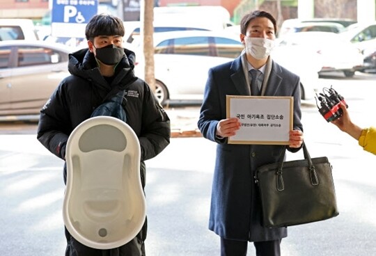| 물빠짐 아기욕조 구매 피해자인 법무법인 대륙아주 이승익 변호사(오른쪽)가 2021년 2월 9일 오전 서울 동작경찰서에서 제조업체와 유통업체를 상대로 한 형사고소장 제출 기자회견을 하고 있다. (사진=연합뉴스) |