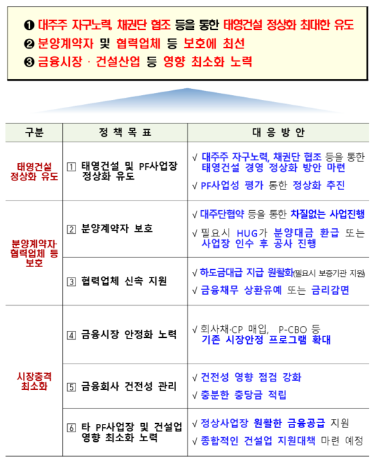 금융당국은 “금융시장 및 건설업 전반으로의 전이 가능성은 제한적이나 시장불안 심리 확산 방지를 위해 금융시장 안정 조치 확대 및 건설투자 활성화 방안을 마련 중”이라고 밝혔다.