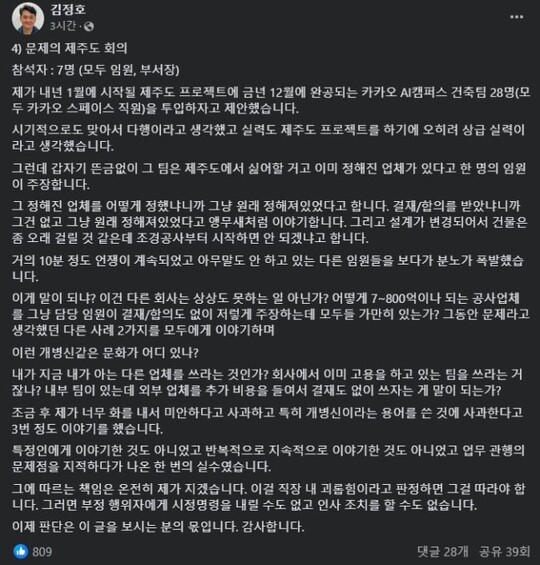 | 지난 28일 김정호 카카오 CA협의체 경영지원총괄이 페이스북에 올린 반박 입장문. (사진=페이스북 캡처) |