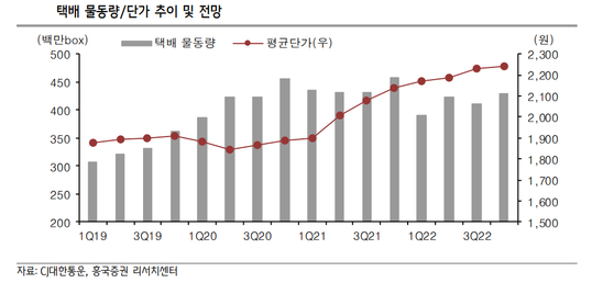 이병근 흥국증권 연구원은 “올해 택배 단가 인상을 통해 동사의 택배 사업부 영업이익은 개선될 전망”이라면서 “또한, 지난해 1분기 택배 파업으로 인해 물동량이 감소했다는 점을 감안하면, 물동량은 전년대비 증가할 것”이라고 예측했다.