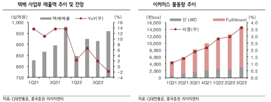 지난 10월~11월 택배 처리량은 2억8000만 박스(-6.9% YoY)를 기록했다. 경기 둔화와 저수익 고객 디마케팅에 따른 물량 감소로 전분기에 이어 전년 대비 역성장할 전망이다.