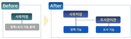 구체적으로 현재 사무처를 총괄하고 있는 사무처장(1급)은 정책 기능을, 신설되는 조사관리관(1급)은 조사 기능을 맡는다. 이에 따라 앞으로 사무처장은 조사업무에 관여할 수 없게 된다. 그간 부서 내 기능이 혼재해 통솔과 지휘에 한계가 있고 업무 효율성이 떨어진다고 판단했기 때문이다.