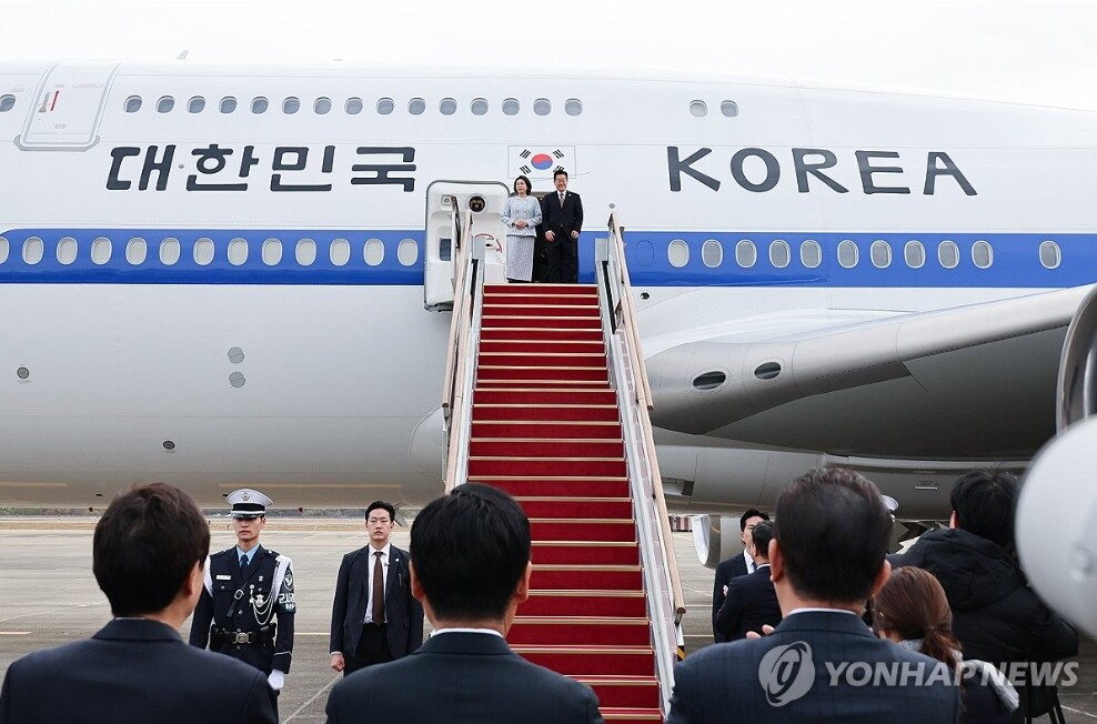 | 주요 20개국(G20) 정상회의 참석을 계기로 UAE·이집트·튀르키예 등 4개국 순방에 나서는 이재명 대통령과 김혜경 여사가 17일 성남 서울공항에서 공군 1호기에 올라 인사하고 있다. (사진=연합뉴스) |