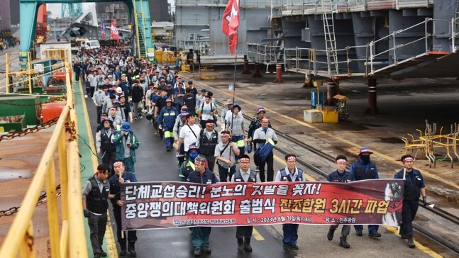 28일 노동조합은 전 조합원을 대상으로 한 파업 지침을 내리고 이날 오후 2시부터 3시간 동안 울산 조선소 내에서 활동을 중단, 노조사무실 앞에서 중앙쟁의대책위원회의 공식 출범식을 가졌다.