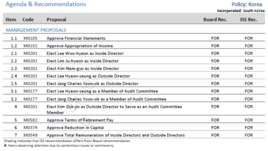 ISS는 세계 투자자의 70% 이상이 ISS의 의견을 참고하여 의결권을 행사하고 기업 주주총회 안건을 세계 투자자들을 대상으로 면밀히 분석해 의결권 행사 가이드라인을 제시하는 기관이다.
