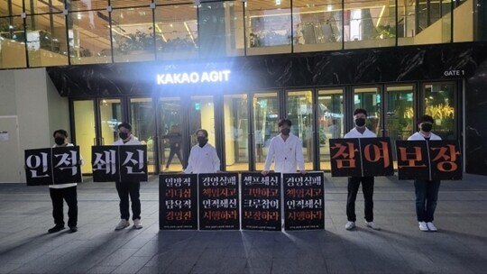 카카오 노조는 4일 경기 성남 신사옥인 카카오아지트에서 '경영 실패 책임지고 인적 쇄신 시행하라', '셀프 쇄신 그만하고 크루(임직원) 참여 보장하라' 등 요구사항이 적힌 팻말을 들고 시위에 나섰다.