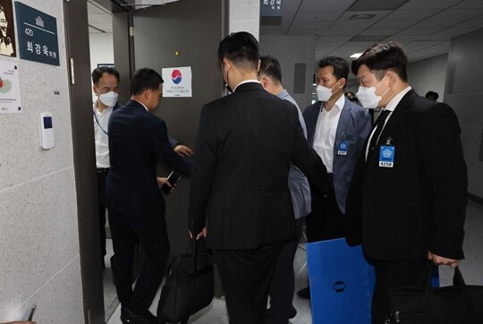 | 서울경찰청 반부패·공공범죄수사대 수사관들이 5일 압수수색을 위해 국회 의원회관 더불어민주당 최강욱 의원실로 들어서고 있다. (사진=연합뉴스) |