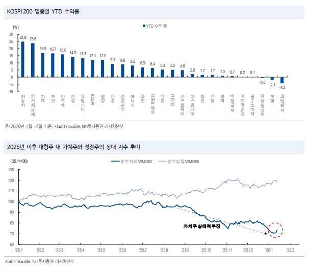 나정환 NH투자증권 연구원은 "최근 코스피 시장에서 철강, 화학 등 가치주가 반등하는 모습이 관찰된다"며 "포트폴리오 관점에서 기존 AI 주도주와 함께 금융, 소재 등 가치주도 동시에 담는 바벨 전략을 고려할 필요가 있다"고 조언했다.