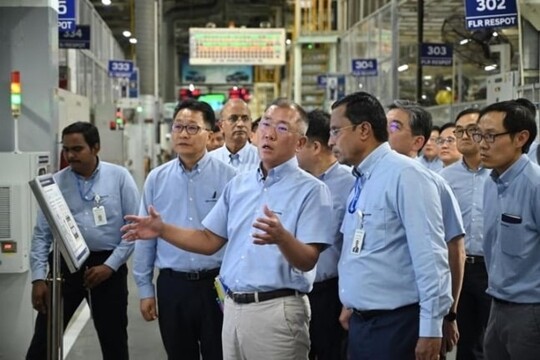 | 정의선 현대차그룹 회장이 지난 8일 인도 첸나이에 있는 현대차 공장에서 인도법인 임직원들과 내부를 둘러보고 있다. (사진=현대차그룹) |