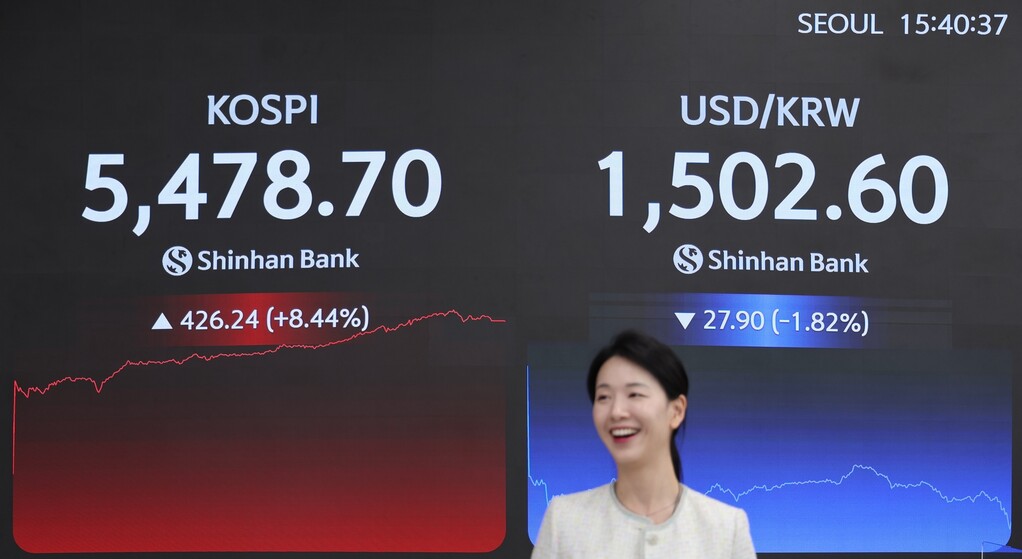 1일 코스피 지수는 전 거래일보다 426.24포인트(8.44%) 급등한 5478.70에 거래를 마쳤습니다.