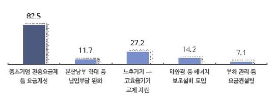 가장 도움이 될 것 같은 지원 정책(복수 응답)은 중소기업 전용요금제 등 요금 개선(82.5%)이 압도적이었다. 전기요금 개선과 관련해 가장 시급한 부분으로는 전력산업기반기금 부담금 인하(55.7%)가 가장 많이 꼽혔다.